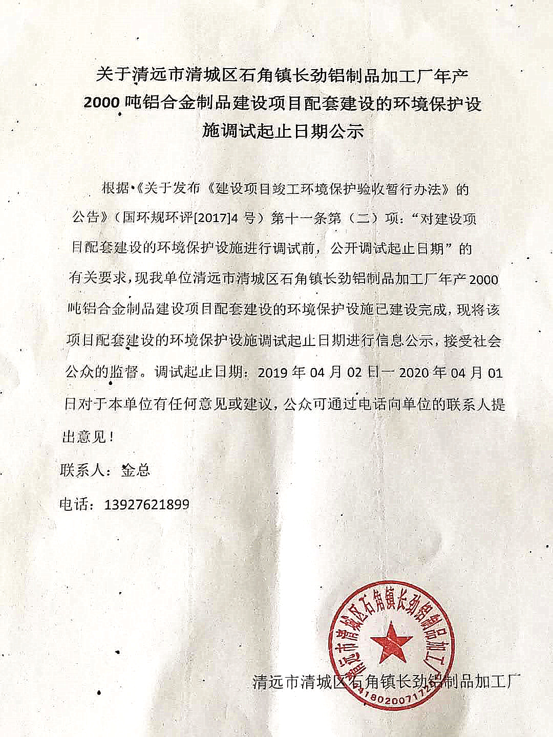 關(guān)于清遠(yuǎn)市清城區(qū)石角鎮(zhèn)長勁鋁制品加工廠年產(chǎn)2000噸鋁合金制品建設(shè)項(xiàng)目配套建設(shè)的環(huán)境保護(hù)設(shè)施調(diào)試起止日期公示