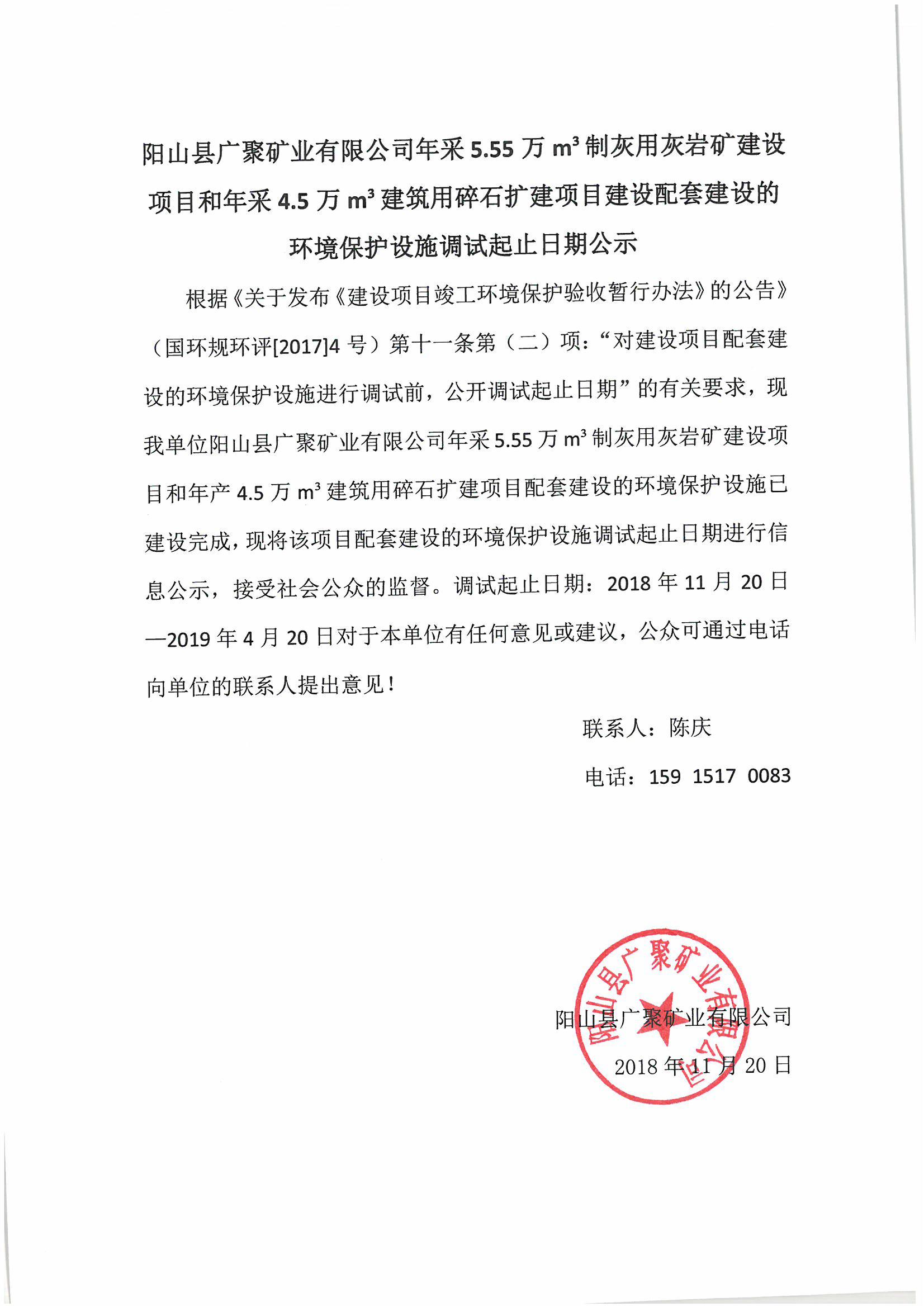 陽山縣廣聚礦業(yè)有限公司年采5.55萬m3制灰用灰?guī)r礦建設(shè)項(xiàng)目和年采4.5萬m3建筑用碎石擴(kuò)建項(xiàng)目建設(shè)配套建設(shè)的環(huán)境保護(hù)設(shè)施調(diào)試起止日期公示