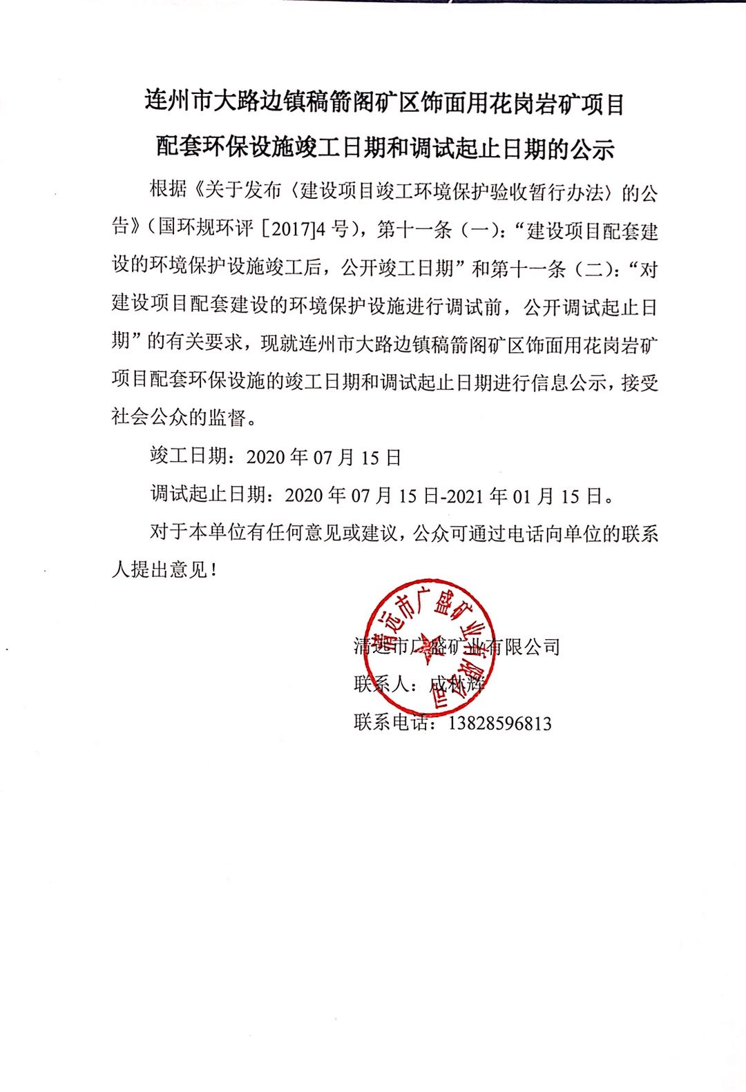 連州市大路邊鎮(zhèn)稿箭閣礦區(qū)飾面用花崗巖礦項(xiàng)目 配套環(huán)保設(shè)施竣工日期和調(diào)試起止日期的公示