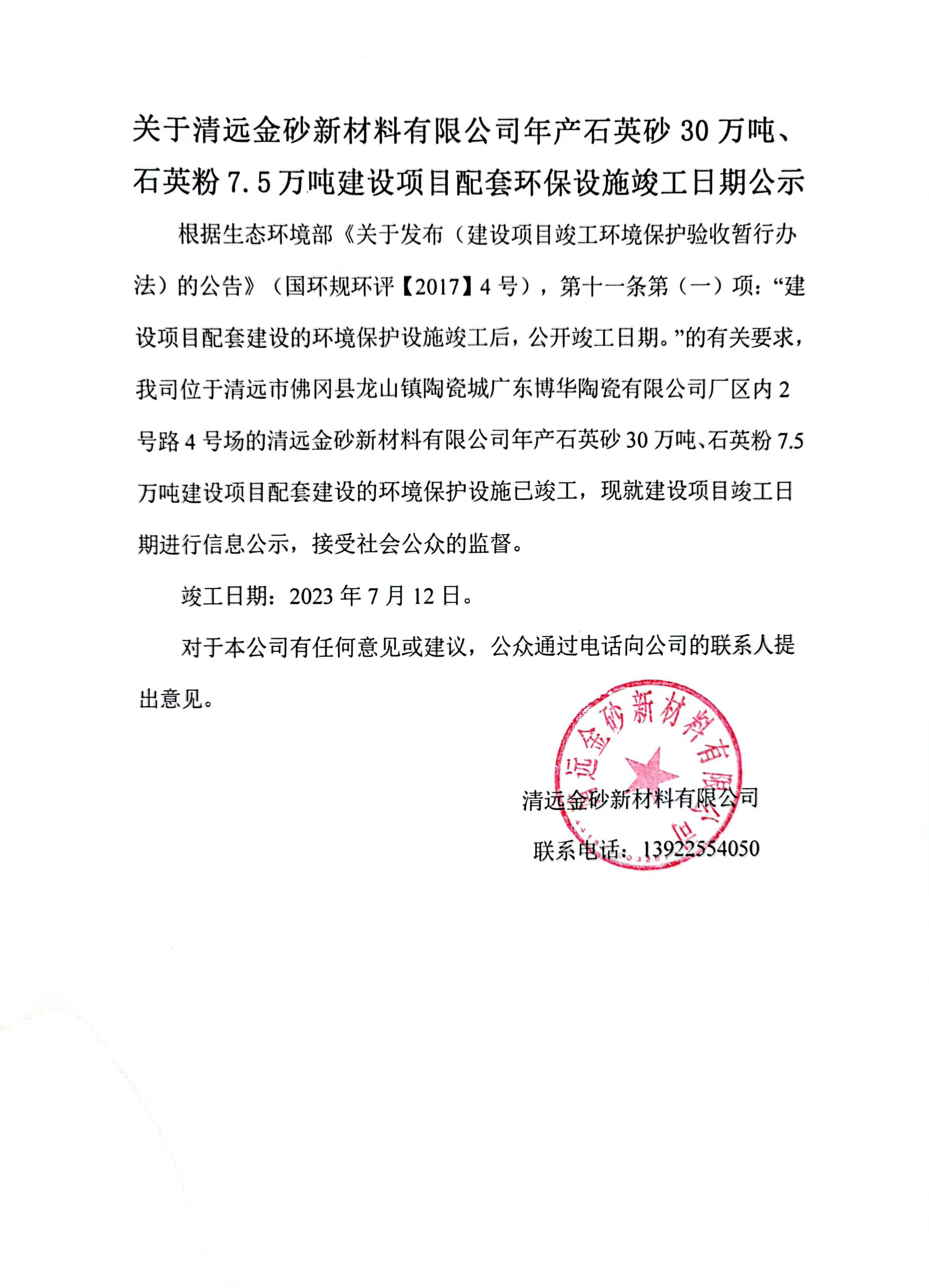 關(guān)于清遠金砂新材料有限公司年產(chǎn)石英砂30萬噸、石英粉7.5萬噸建設(shè)項目配套環(huán)保設(shè)施竣工日期公示